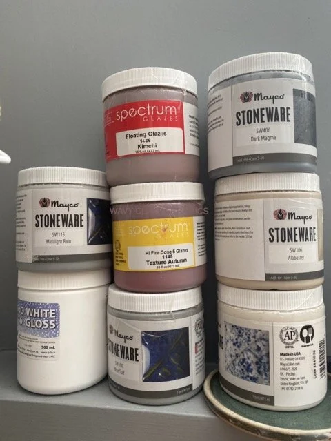 Tip: Brush-on glazes are a great starting point when space-saving is a priority. My go-to glazes are from Mayco and Spectrum. They’re easy to use and come in a variety of colours and container sizes, food safe, decorative..the list goes on. Start with a pint and test, test, test!